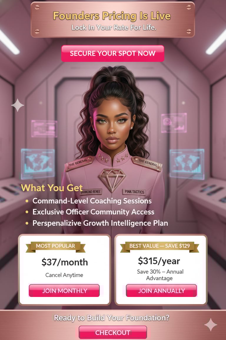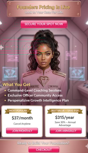 Enrollment in Pink Tactics Boot Camp is available for $37/month or $315/year, giving you two accessible ways to step into structure, discipline, and command-level leadership.